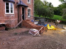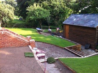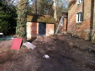 This shows the front of the property during the build. Please note the massive change in levels, here created using green oak sleepers.